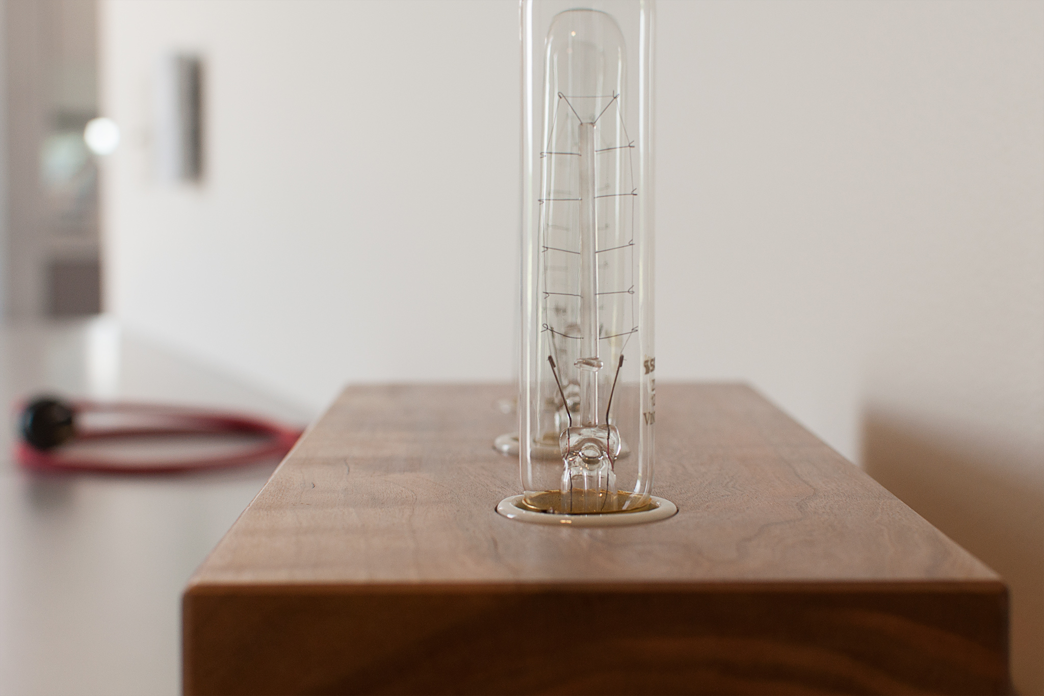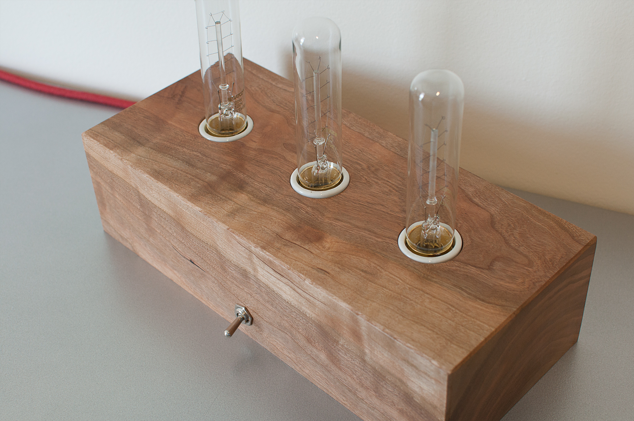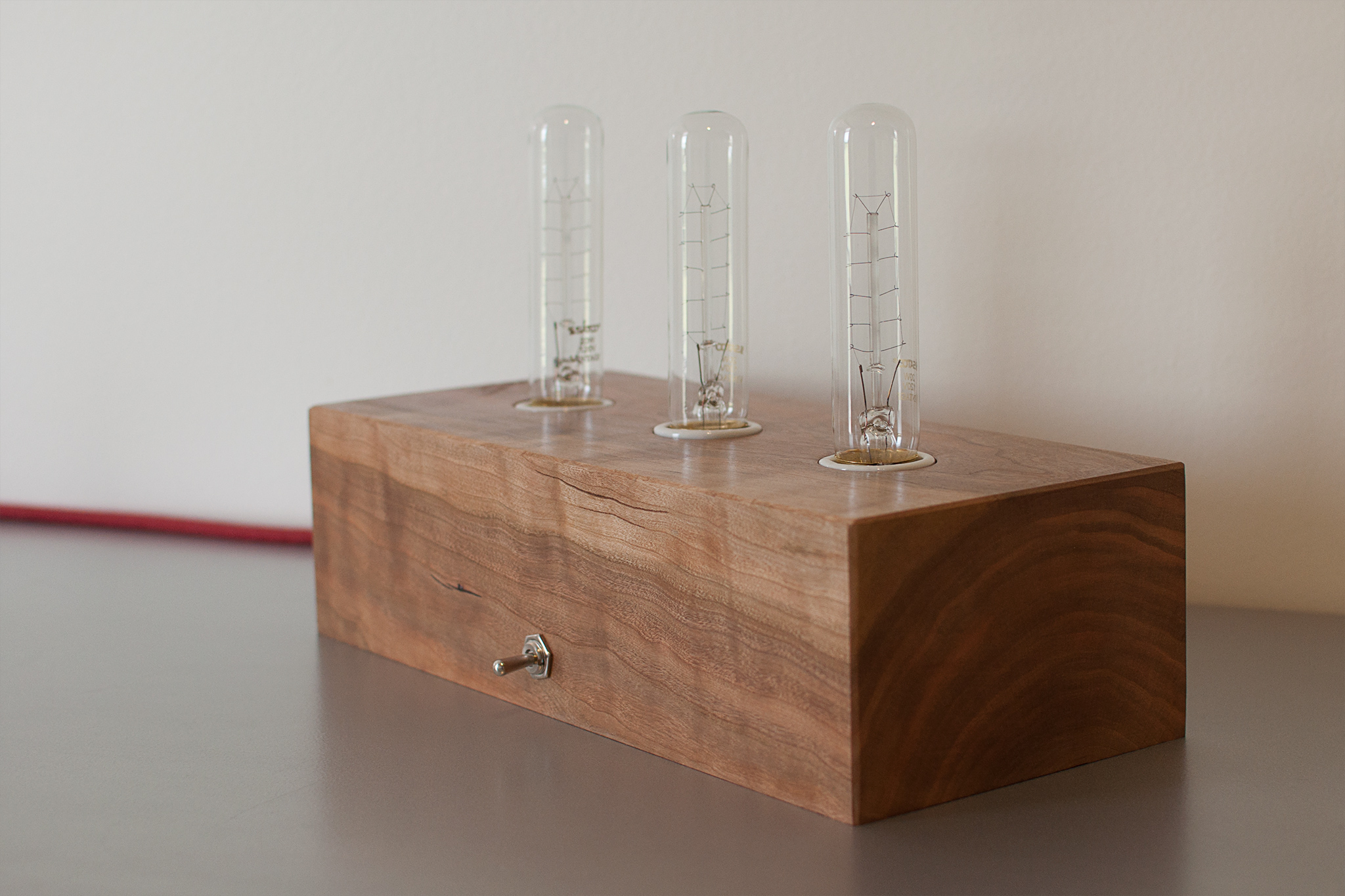 Cube Lamp no 5 is made from a combination of natural and high quality materials and finished with a hand-rubbed oil. Available in cherry, or reclaimed oak, this desk lamp features a toggle on/off switch and braided vintage reproduction wire/plug. Made to order, Cube Lamp no 5 ships in 2-3 weeks time. Bulbs included. Dimensions are approximately 12″ x 5″ x 3″.
